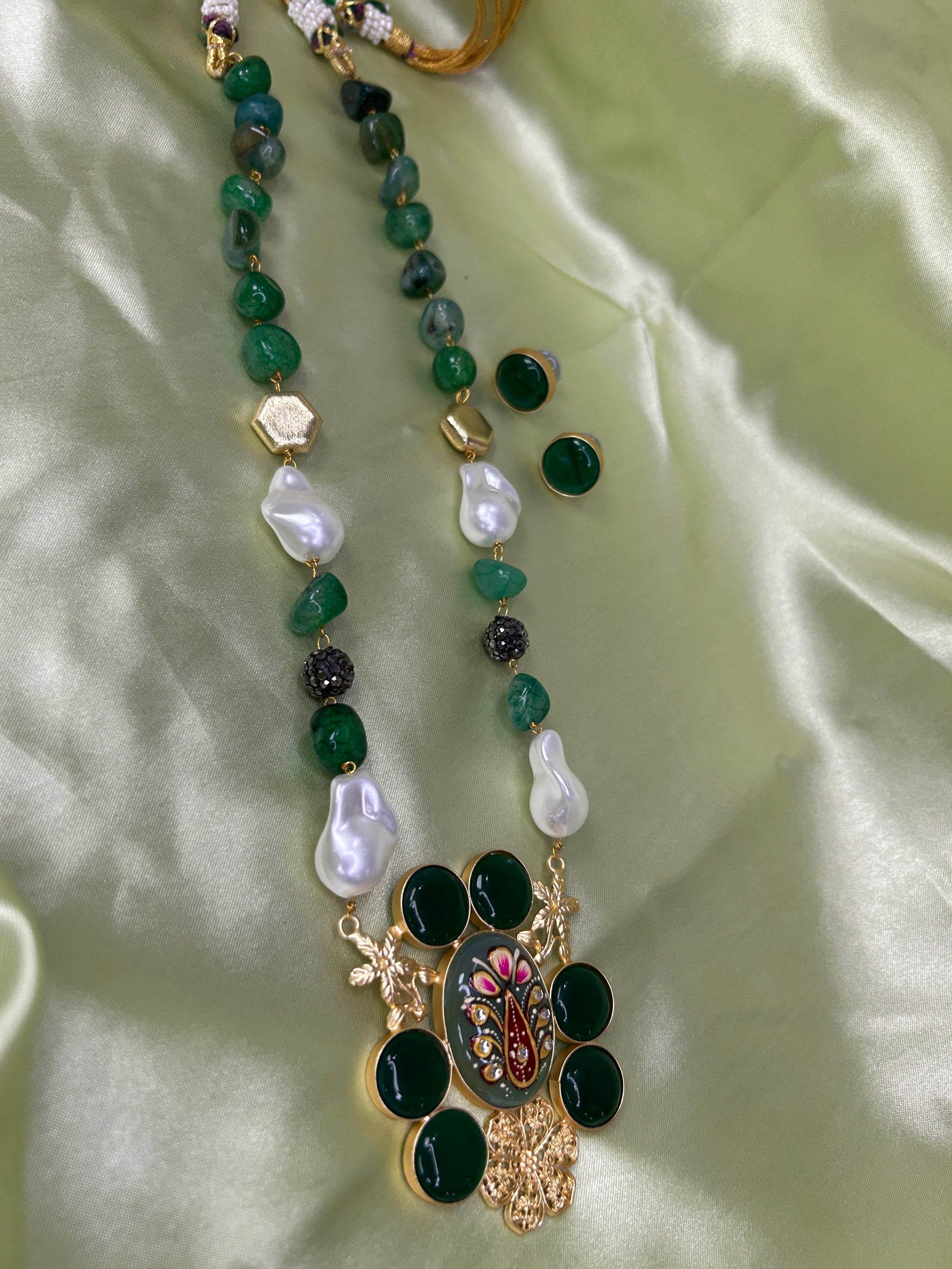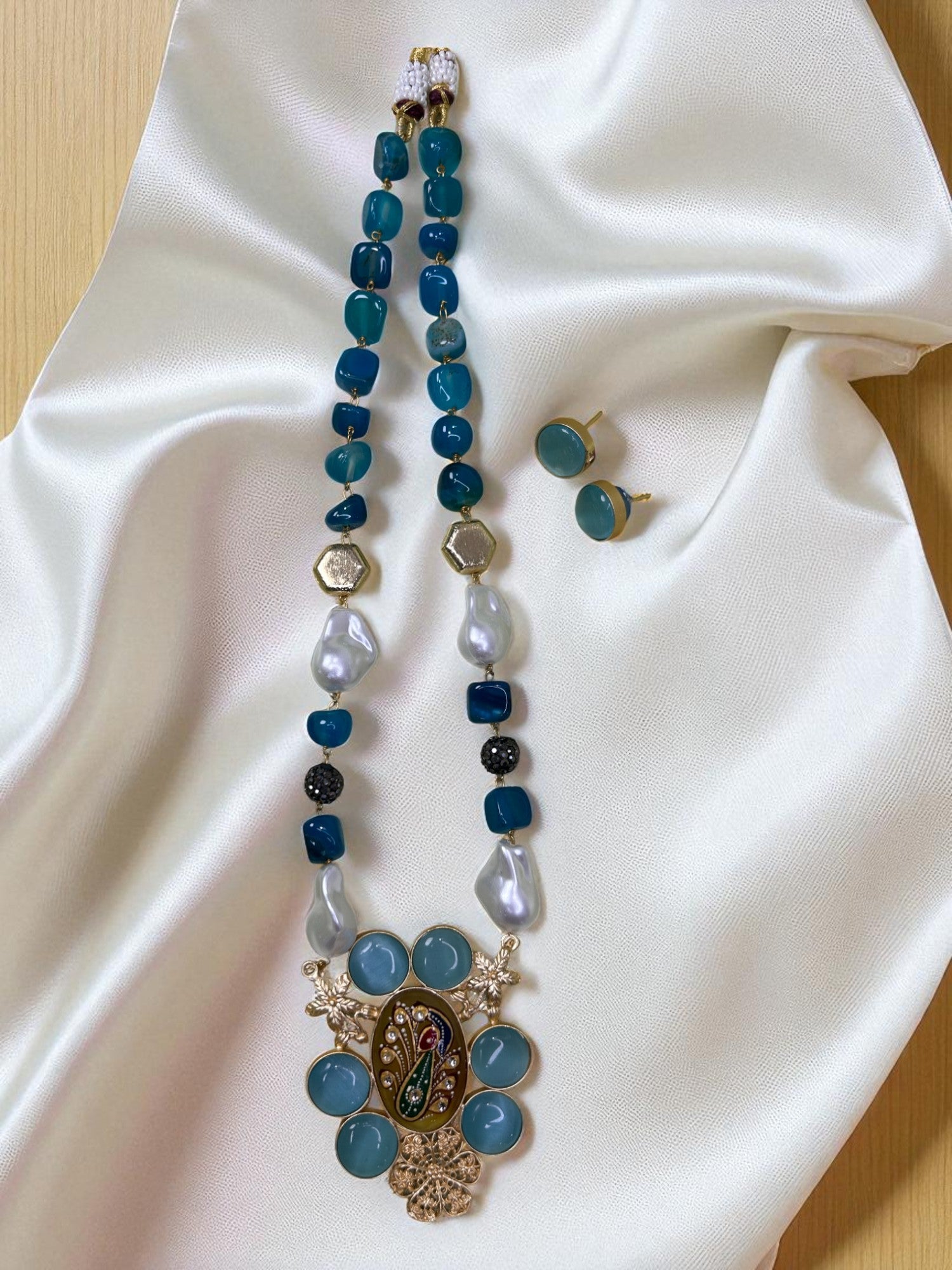 This striking necklace features a dual-strand arrangement of polished blue onyx beads paired with irregular baroque pearls and gold-toned hexagonal accents. The statement pendant showcases an intricate peacock-inspired design framed by circular blue stones and delicate metallic motifs. Accompanied by matching stud earrings, this piece blends vibrant colour, rich artistry, and traditional charm—perfect for festive attire and elegant cultural celebrations.