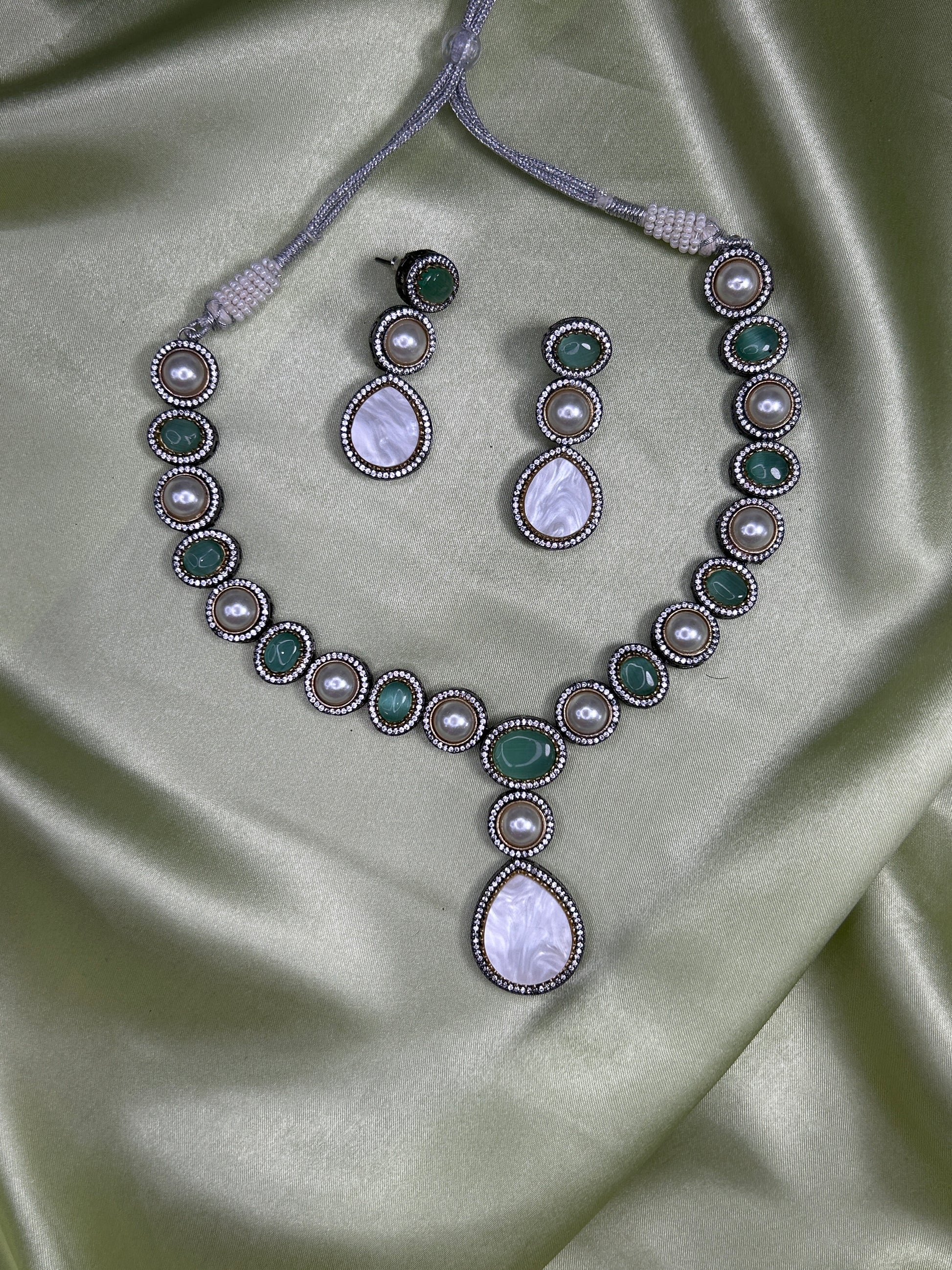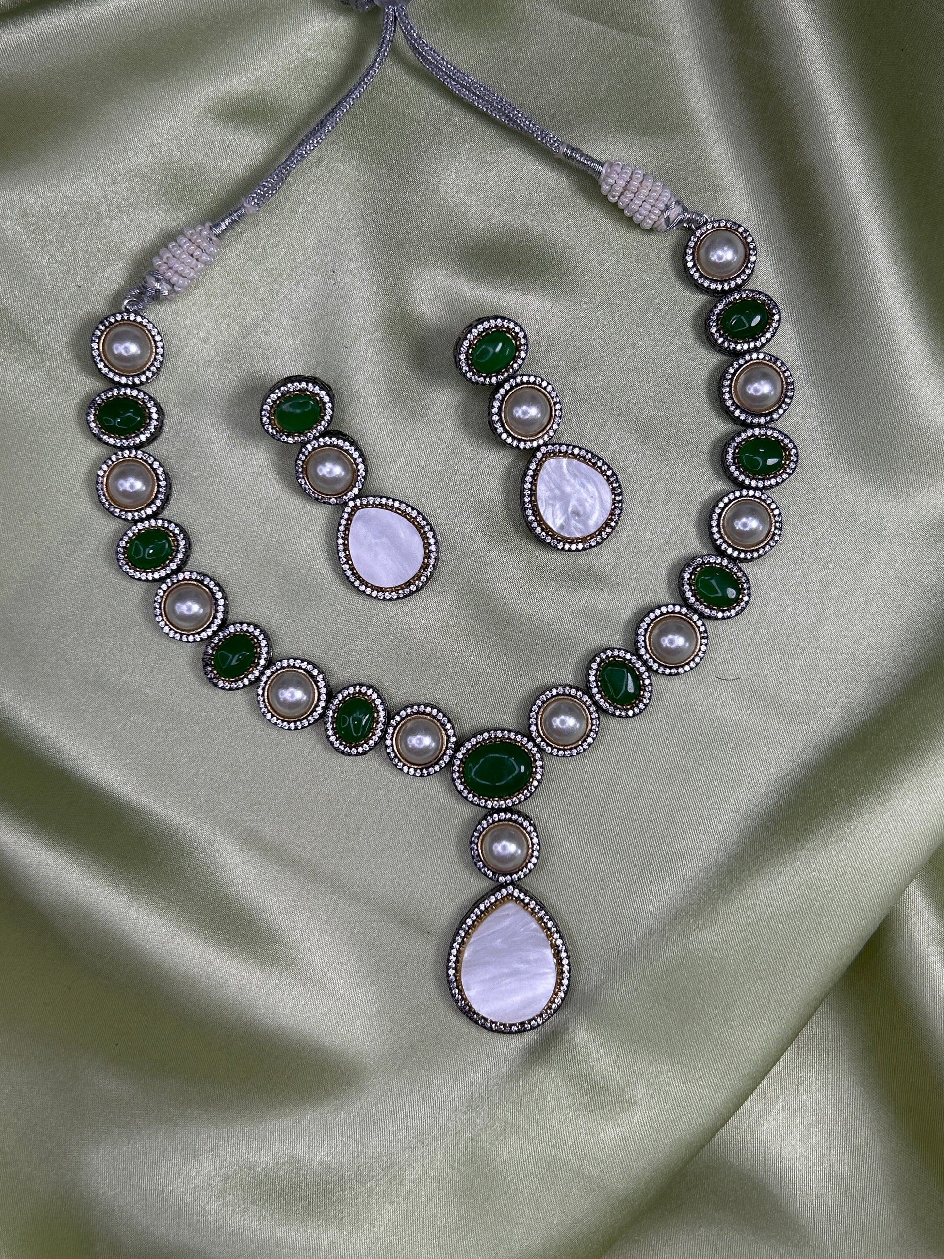 Add a regal touch to your look with this beautifully handcrafted Victorian-style necklace set. Featuring deep Emerald green stones, luminous faux pearls, and a bold mother of pearl teardrop pendant, this designer piece is perfect for weddings, parties, or festive occasions. The matching drop earrings complete the royal charm.