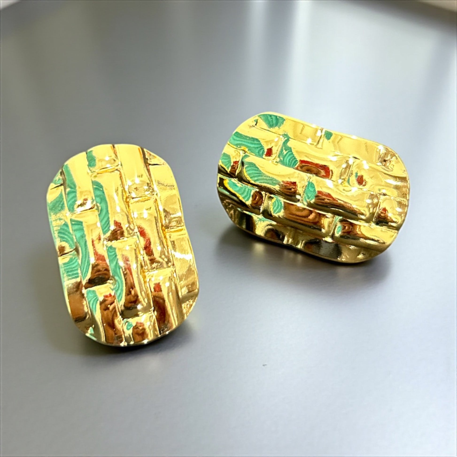 Crafted in gold-tone stainless steel, these earrings showcase a distinctive textured pattern and bold silhouette—merging contemporary flair with classic charm.
