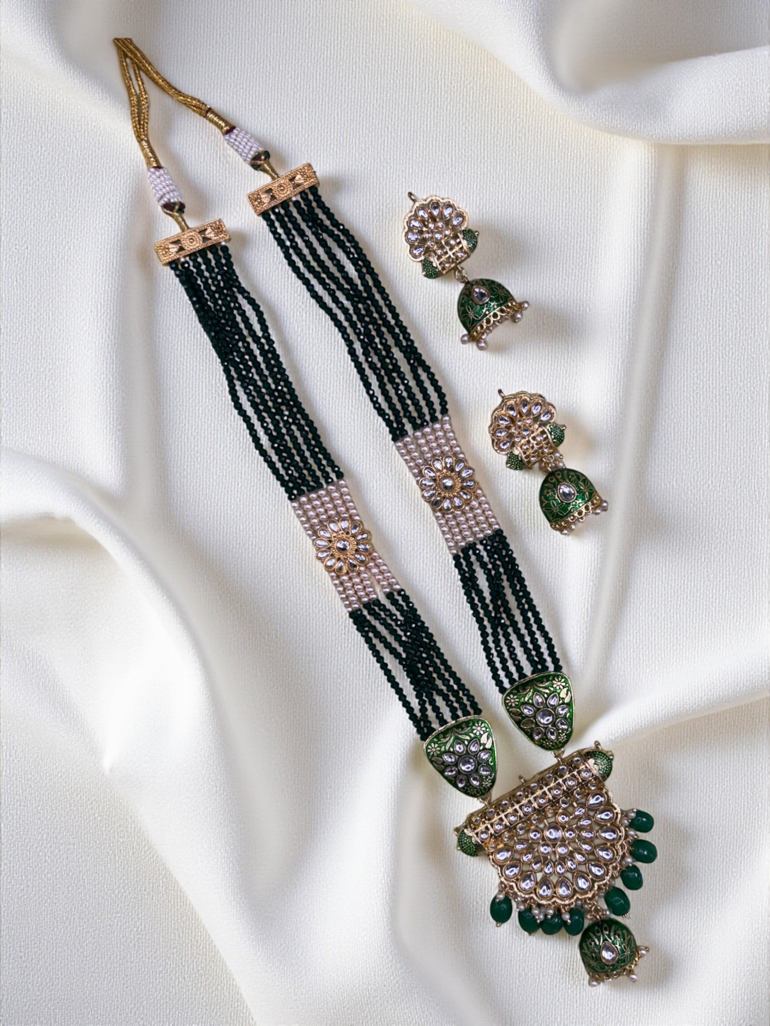 Featuring deep green beaded strands, ivory accents, and a grand royal green enamel pendant with Kundan accents and matching earrings, this set is crafted to steal the spotlight at every celebration.