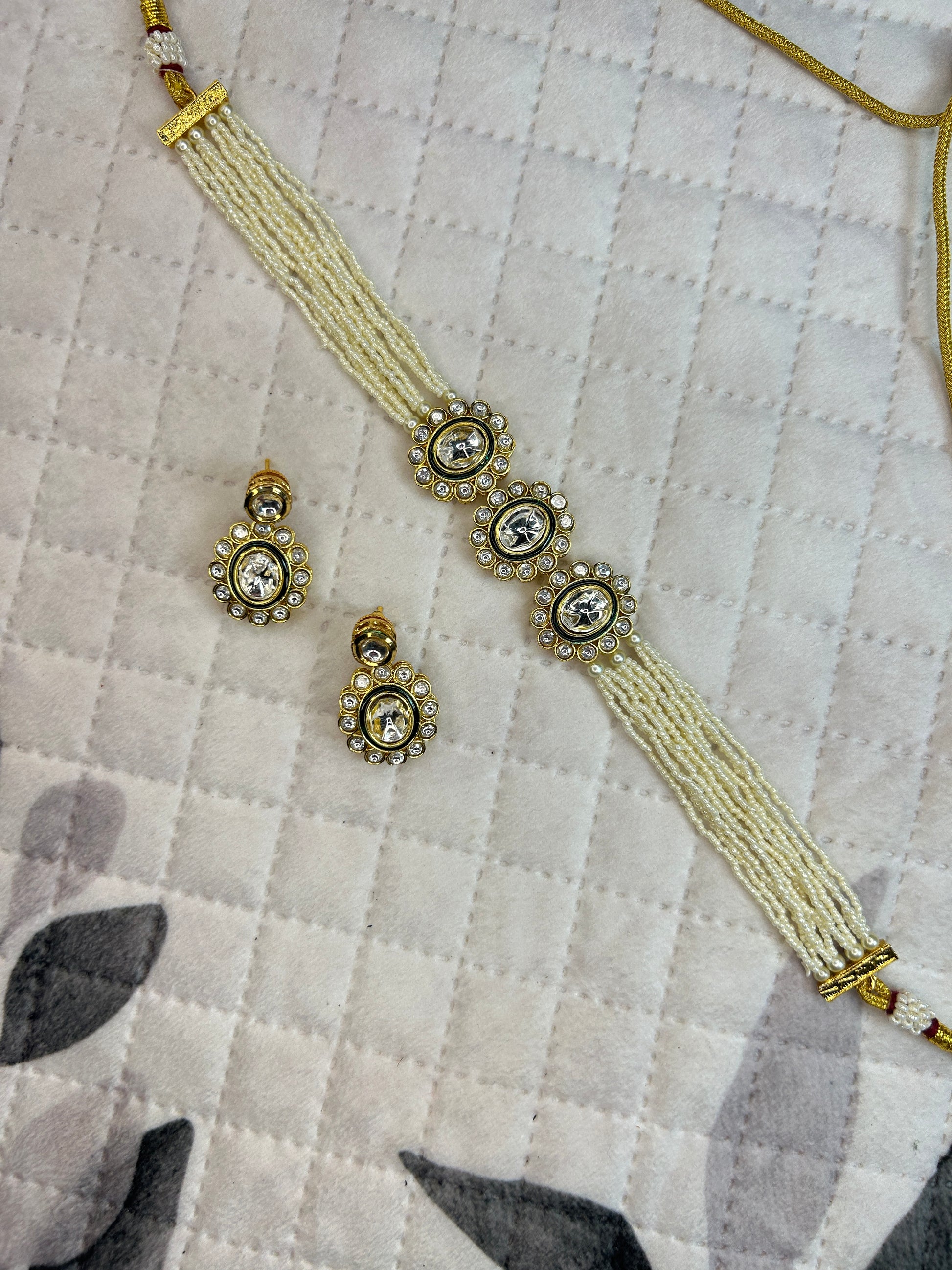 This elegant choker set features multiple strands of delicate white pearls brought together with five circular kundan motifs accented by shimmering stones and a border of rich emerald-green beads. The matching earrings mirror the same floral-inspired design, creating a cohesive and regal look. Perfect for weddings, festive occasions, and traditional attire, this set blends classic charm with timeless sophistication.